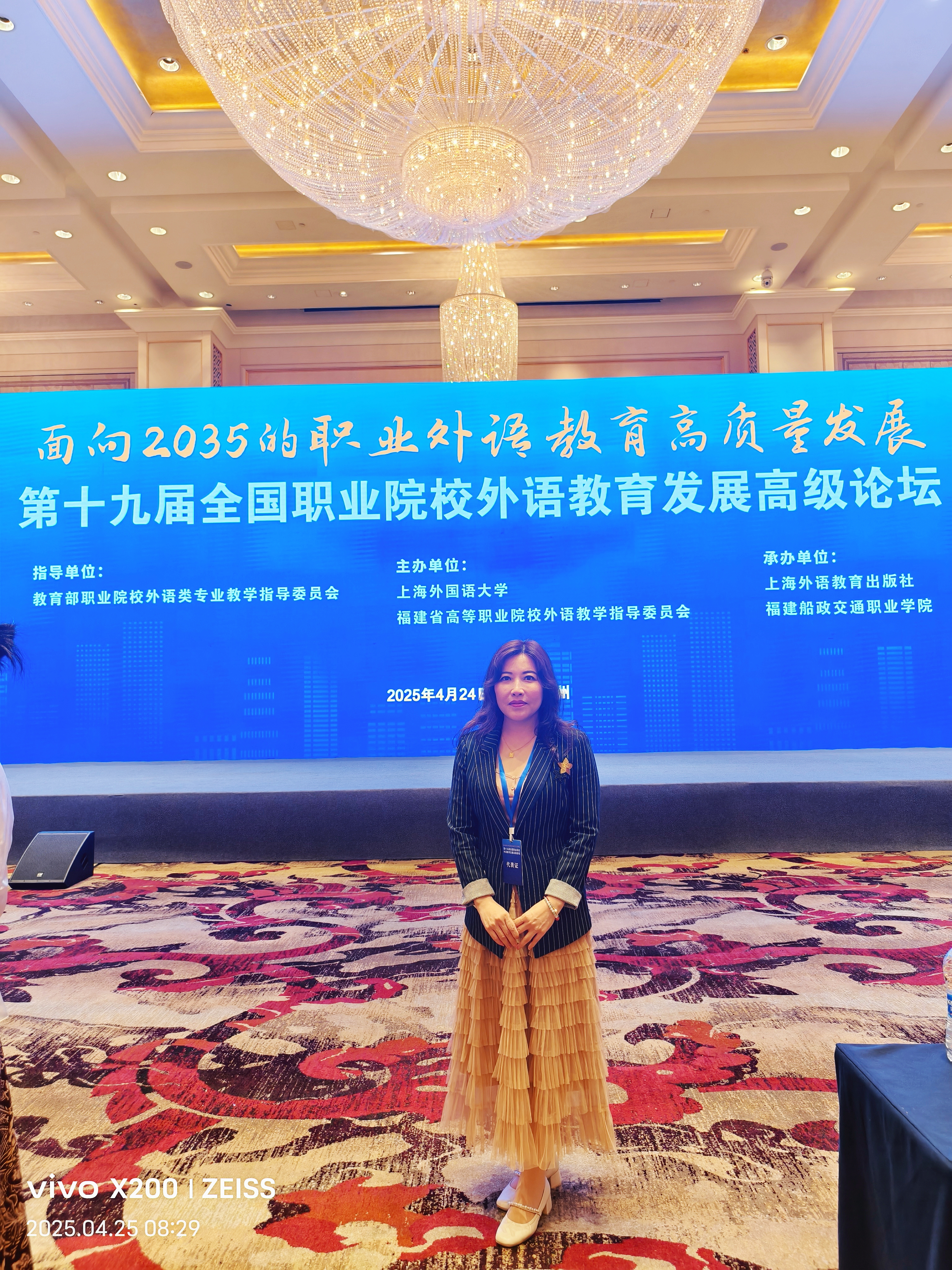 本网讯(通讯员 王否 赵丹)第十九届全国职业院校外语教育发展高级论坛于4月25-26日在福州举行。本次论坛由教育部职业院校外语类专业教学指导委员会指导、上海外国语大学主办,以”面向2035的职业外语教育高质量发展”为主题,吸引了全国300余所高校的专家齐聚一堂,共探职业教育深化改革与数字化转型路径。我校公共基础课部大学外语教研室主任赵丹教授参加了此次论坛。