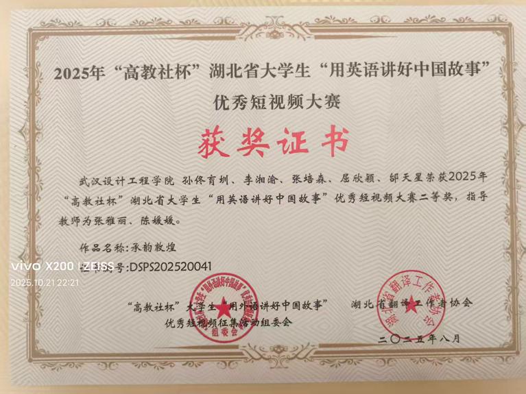 本网讯(通讯员 张雅丽)近日,2025年“高教社杯”湖北省大学生“用英语讲好中国故事”优秀短视频大赛结果揭晓。武汉设计工程学院孙佟育圳、李湘渝、张培森、屈欣颖、邰天星团队凭借作品《承韵敦煌》,在指导教师张雅丽、陈媛媛的带领下,荣获大赛二等奖。