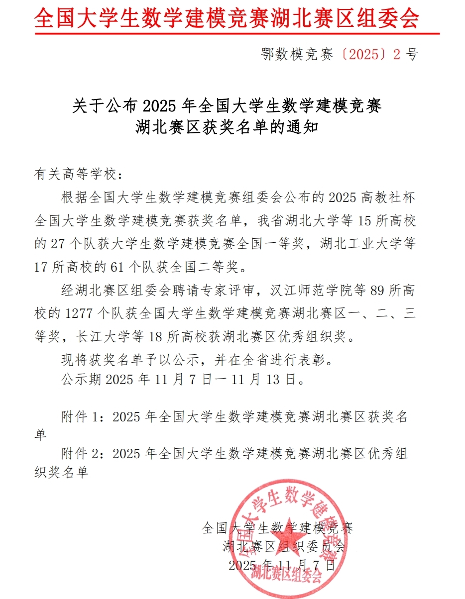 本网讯(通讯员 袁梦玥)近日,从全国大学生数学建模竞赛湖北赛区组委会传来喜讯,2025年湖北省赛区获奖名单正式揭晓。