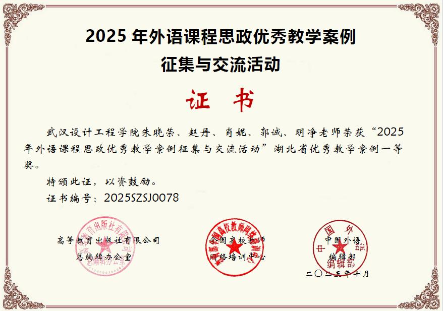 本网讯(通讯员 朱晓荣)近日,由高等教育出版社和全国高校教师网络培训中心主办的“2025年外语课程思政优秀教学案例征集与交流活动”圆满落幕。我部大学外语教研室教师团队朱晓荣、赵丹、肖妮、郭诚、明净五位老师打造的By Harmony, for Harmony教学案例,凭借鲜明的思政导向、创新的教学设计与扎实的实践成效,从全省百余所高校的参赛作品中脱颖而出,荣获湖北省优秀案例一等奖。