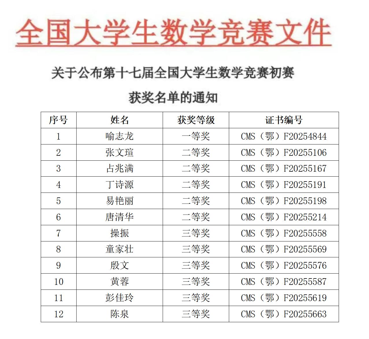 本网讯(通讯员 朱垚)近日,由中国数学会主办的第十七届全国大学生数学竞赛获奖名单正式揭晓。我校学子凭借扎实的数理功底、卓越的逻辑思维与顽强的拼搏精神脱颖而出,最终斩获非数学专业组一等奖1名、二等奖5名、三等奖6名的优异成绩。