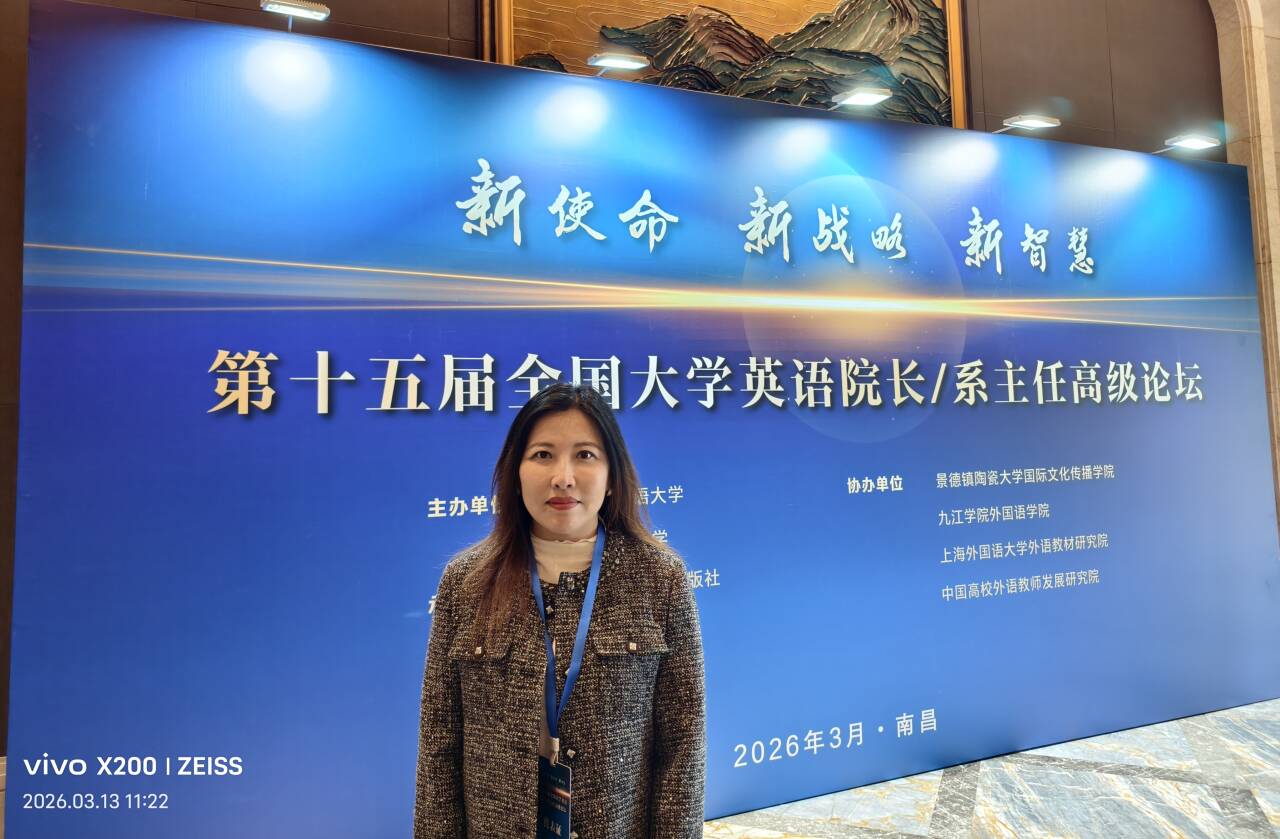 本网讯(通讯员 王否 赵丹)2026年3月12-15日,第十五届全国大学英语院长/系主任高级论坛在江西南昌成功举办,本届论坛由上海外国语大学主办,以“新使命 新战略 新智慧”为主题,汇聚全国 1000 余名外语教育领域专家学者,围绕人工智能赋能教育、大学英语教育改革、复合型国际化人才培养等核心议题展开深度研讨。我校公共基础课部大学外语教研室主任赵丹教授受邀参加此次论坛,与全国同行共探外语教育高质量发展新路径。
